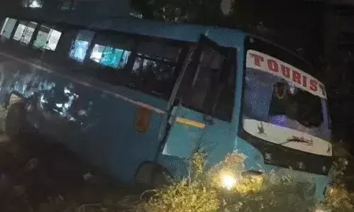 टक्कर मारने के बाद बस से उतरकर भागा ड्राइवर- गड्ढे में गिरी बस