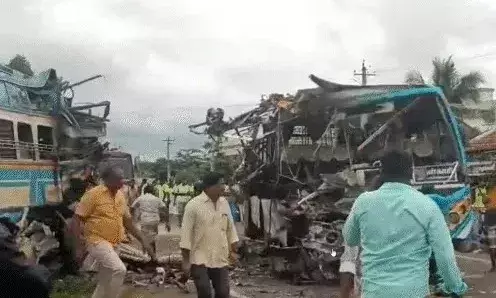आमने सामने की टक्कर के बाद बसों के उड़े परखच्चे-6 यात्रियों की मौत