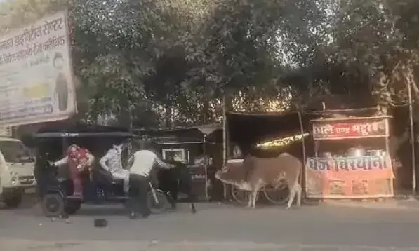 सांडों की लड़ाई की चपेट में आया सवारियों से भरा ई रिक्शा सड़क पर पलटा
