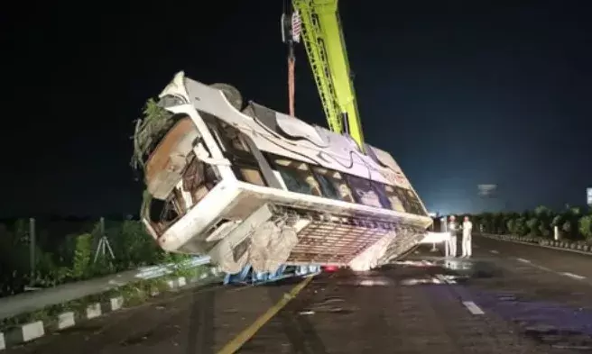 एक्सप्रेस वे पर हादसा- हाईवे से उतरकर पलटी- बस यात्रियों में चीख पुकार