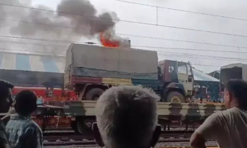 मालगाड़ी में सवार सेना के ट्रक में लगी आग- हाई टेंशन लाइन से ट्रक का..