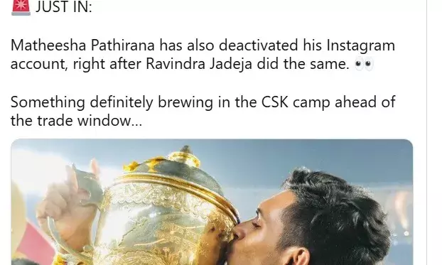 इंडियन प्रीमियर लीग टीम चेन्नई सुपर किंग्स के दो अहम खिलाड़ियों ऑलराउंडर रवींद्र जडेजा एवं तेज गेंदबाज मधिशा पथिराना के इंस्टाग्राम से अकाउंट अचानक गायब हो गए हैं, जिससे सीएसके के प्रशंसकों के बीच हलचल मच गई है। दोनों खिलाड़ियों ने लगभग एक ही समय पर इंस्टाग्राम से अपने अकाउंट डीएक्टिवेट किए हैं, जिससे सोशल मीडिया पर शुरू हुई सवालों की बौछार के बीच सीएसके फैंस सोशल मीडिया पर पूछ रहे हैं कि आखिर सीएसके में क्या चल रहा है?