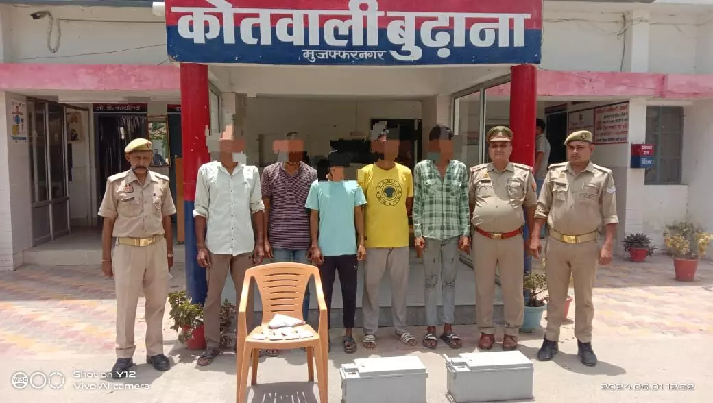 शनिवार को जनपद मुजफ्फरनगर में शातिर चोरों एवं लुटेरों की गिरफ्तारी हेतु वरिष्ठ पुलिस अधीक्षक अभिषेक सिंह के निर्देशन में चलाये जा रहे अभियान के अन्तर्गत, पुलिस अधीक्षक ग्रामीण आदित्य बंसल के निकट पर्यवेक्षण में, क्षेत्राधिकारी बुढ़ाना गजेन्द्रपाल सिंह तथा प्रभारी निरीक्षक आनन्द देव मिश्रा के कुशल नेतृत्व में आज उ0नि0 संदीप चौधरी, उ0नि0 सुधीर कुमार, उ0नि0 सुरेन्द्र राव, उ0नि0 संदीप कुमार, है0का0 निर्वेश कुमार, है0का0 सुनिल कुमार, है0का0 सोनू सिरोही, है0का0 देवेन्द्र कुमार, का0 मोहित चौधरी, का0 अंकित कुमार की टीम ने मोबाईल टावर से बैट्री चोरी तथा एक अन्य भैंस चोरी का घटना का सफल अनावरण करते हुए मुखबिर की सूचना पर मंदवाड़ा रोड पर बडे कूडाघर के पीछे से 05 शातिर अभियुक्तों सुऐब पुत्र इस्लाम निवासी मदीना मस्जिद के पास 30 फुटा रोड थाना लोनी जिला गाजियाबाद, फरमान पुत्र नसीम निवासी ग्राम हुसैनपुर कलां थाना बुढाना, मुजफ्फरनगर, रहमान पुत्र महताब निवासी ग्राम हुसैनपुर कलां थाना बुढाना, मुजफ्फरनगर, वाजिद पुत्र महबूब निवासी ग्राम हुसैनपुर कलां थाना बुढाना, मुजफ्फरनगर तथा मोमीन उर्फ गुप्ता पुत्र यासीन निवासी मान सिंह नगर थाना गोकुलपुरी मुस्तफाबाद, दिल्ली को डकैती की योजना बनाते हुए गिरफ्तार किया गया।