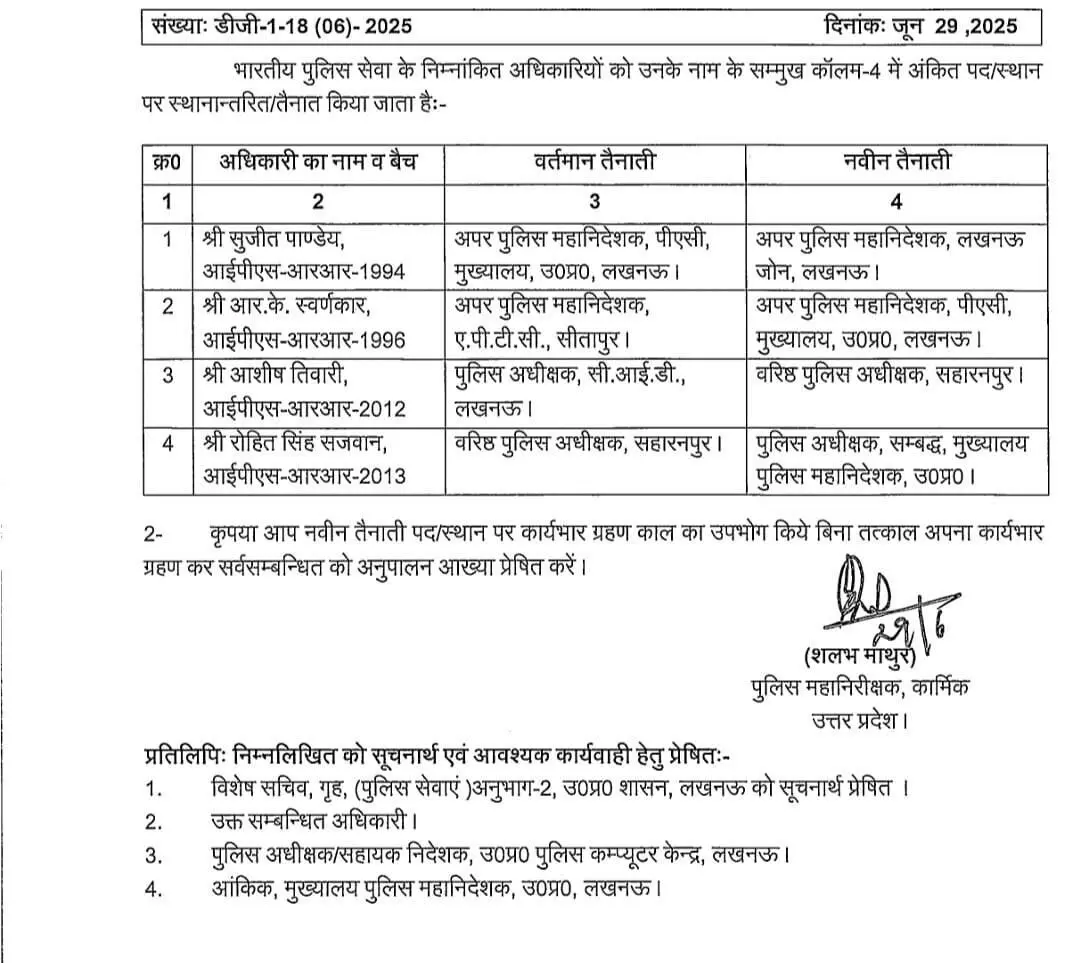 अपर पुलिस महानिदेशक एपीटीसी सीतापुर आईपीएस आर के स्वर्णकार अपर पुलिस महानिदेशक पीएसी मुख्यालय लखनऊ भेजे गए हैं। सीआईडी लखनऊ के पुलिस अधीक्षक आईपीएस आशीष तिवारी को अब पश्चिमी उत्तर प्रदेश के सहारनपुर का वरिष्ठ पुलिस अधीक्षक नियुक्त किया गया है।