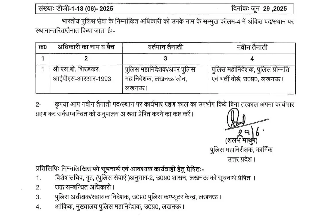 रविवार को उत्तर प्रदेश पुलिस विभाग के पुलिस महानिरीक्षक कार्मिक शलभ माथुर की ओर से जारी की गई आईपीएस अधिकारियों की तबादला सूची के मुताबिक राज्य के पांच आईपीएस अधिकारियों का तबादला कर दिया गया है।