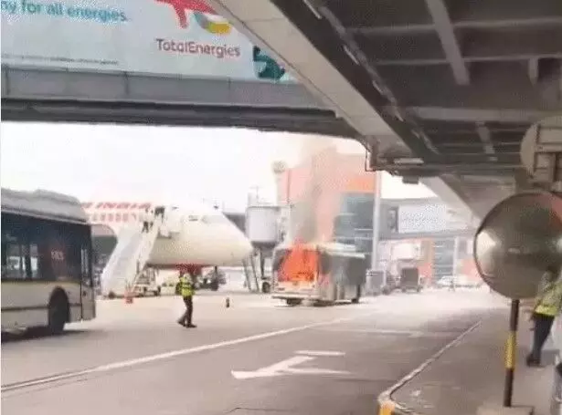सोशल मीडिया पर सामने आए इस घटना के वीडियो में एयरपोर्ट पर खड़ी बस पूरी तरह से आग की लपटों की चपेट में आई दिखाई दे रही है।