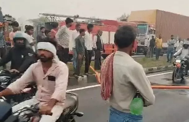 गुरुग्राम जा रहे कंटेनर में लगी आग- बुझाने के चक्कर में लपटों में....