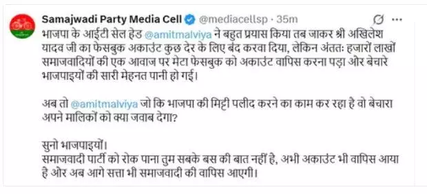 सपा मीडिया सेल नामक अकाउंट से लिखा गया है कि सपा को रोक पाना तुम सबके बस की बात नहीं है, अभी पार्टी मुखिया का फेसबुक अकाउंट वापस आया है और आगे सत्ता भी समाजवादियों की वापस आएगी।