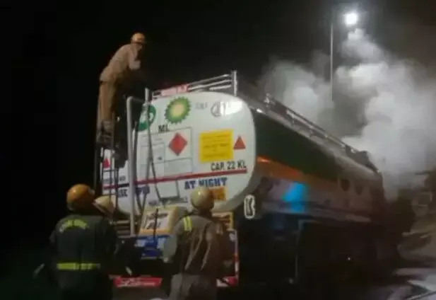 आबादी से होकर सड़क पर जा रहे तेल टैंकर में लगी आग-धूं धूं कर जला टैंकर