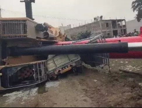 बन रहे रेलवे ब्रिज से नीचे गिरी क्रेन- दबी गाड़ियां- दो की मौत- पिलर..