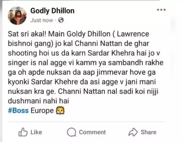 पोस्ट में कहा गया है कि फायरिंग की वजह गायक सरदार खैहरा से चन्नी नटटन की नजदीकियां बढ़ना है, गैंग की ओर इस बाबत अलर्ट करते हुए कहा गया है कि जो भी सिंगर सरदार खैहरा के साथ काम करेगा, वह अपने नुकसान के लिए खुद जिम्मेदार होगा।