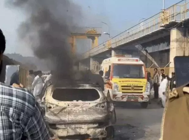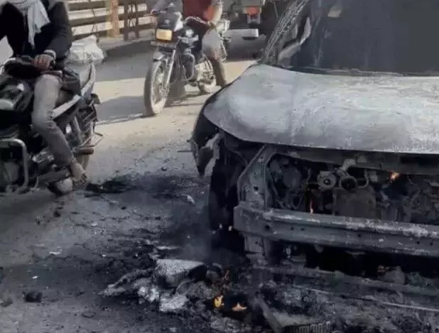 यूपी की दमकल गाड़ी ने कार में लगी आग को बुझा दिया, लेकिन जब तक आज बुझी उस वक्त तक कार पूरी तरह से जलकर राख हो चुकी थी।