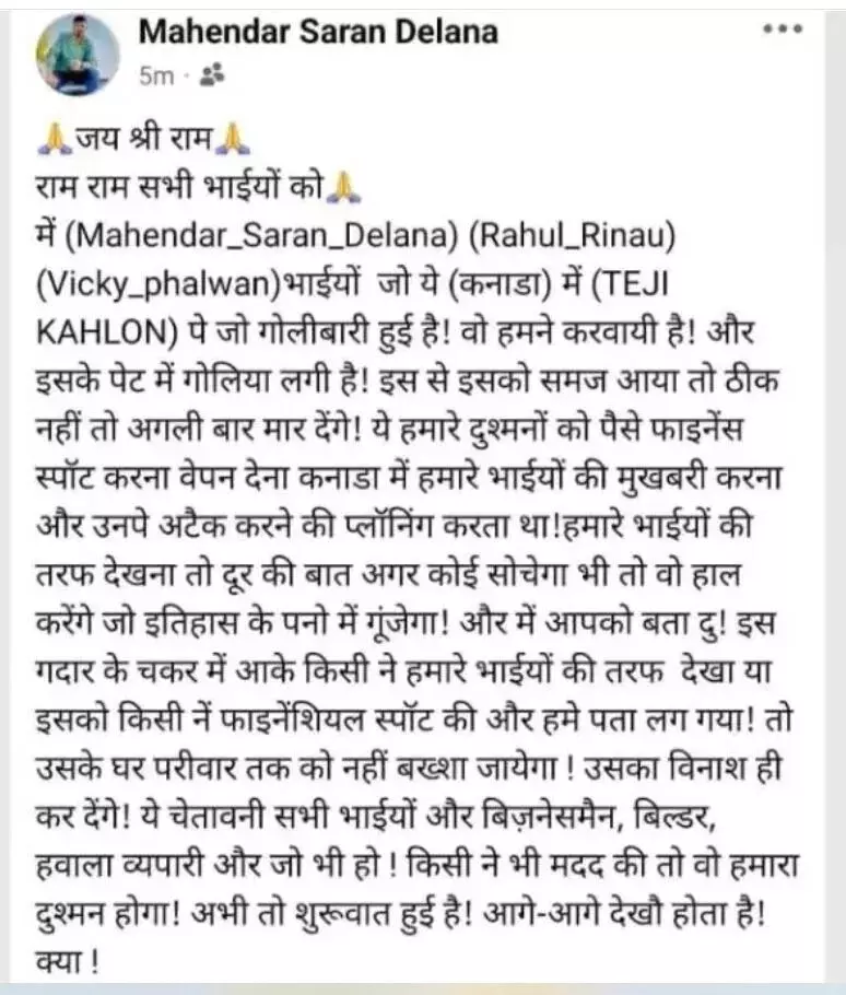 बुधवार को कनाडा में पंजाबी सिंगर तेजी कहलों पर गोलीबारी किए जाने की घटना की जानकारी सामने आई है। मिल रही मीडिया खबरों के मुताबिक पंजाबी सिंगर पर किया गया यह अटैक रोहित गोदारा गैंग में किया है। हमले की बाबत रोहित गोदारा गगन सोशल मीडिया पर एक पोस्ट शेयर कर इसकी जिम्मेदारी ली है।